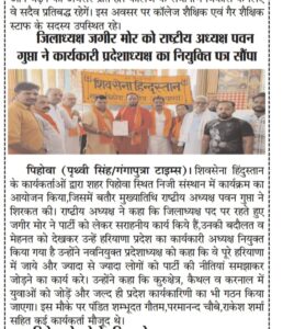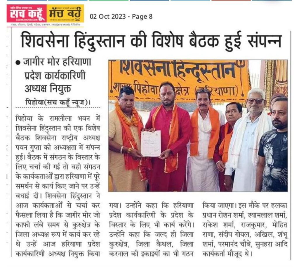 शिवसेना हिंदुस्तान हरियाणा प्रदेश का यह कार्यक्रम जिला कुरुक्षेत्र के पेहवा कस्बे में आयोजित किया गया जिसमें मुख्य अतिथि के रूप में राष्ट्रीय अध्यक्ष श्री पवन गुप्ता जी सम्मिलित हुए और उन्होंने इस कार्यक्रम को संबोधित करते हुए श्री जागीर मोर जी की पार्टी के महत्वपूर्ण सेवाओं को देखते हुए उन्हें हरियाणा इकाई का कार्यकारी प्रदेश अध्यक्ष नियुक्त करने की घोषणा की